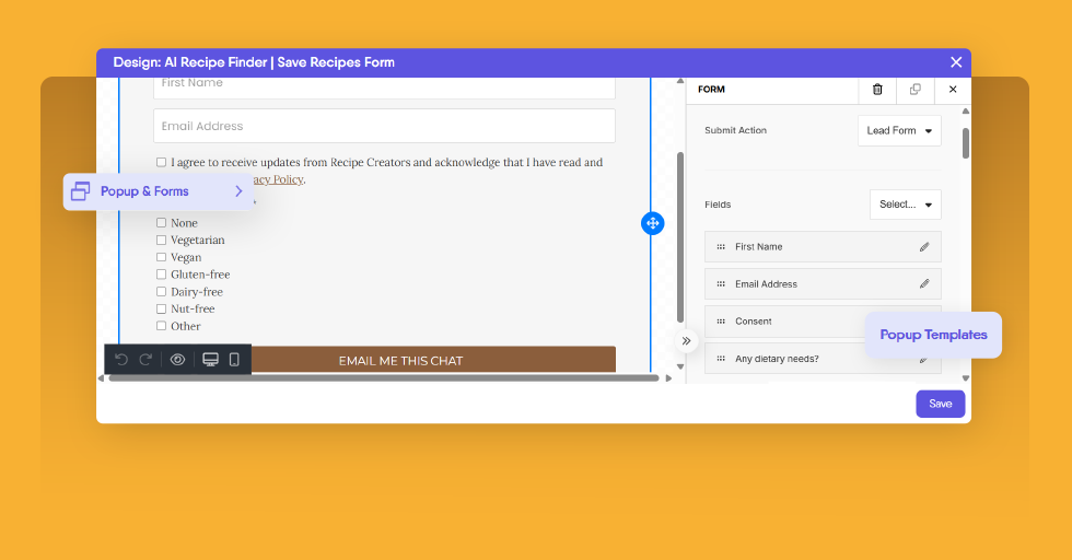 Throughout the guide, I’ll be using the Popups & Forms feature in LeadsWithDemos to build and trigger the AI recipe finder email capture form at the right moment (pop-ups grab attention, while embedded forms blend naturally with your content).