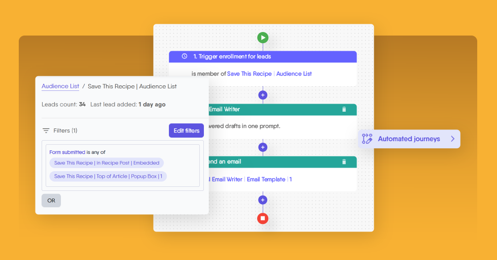 In simple terms, a LeadsWithDemos Automated Journey is a workflow that starts when a reader submits your “Save This Recipe” form. Then, the journey sends emails at the specified time.