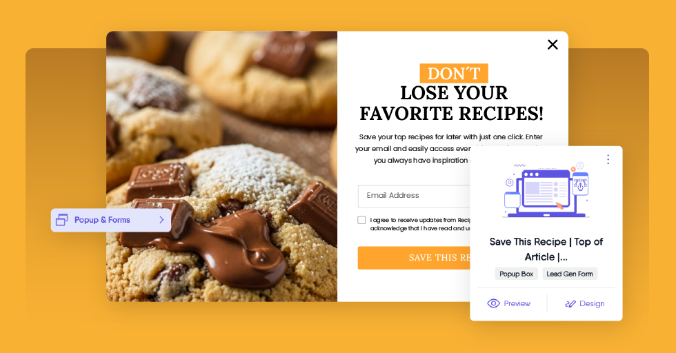 Here’s the fastest way to think about it; a “Save Recipe” popup is a small, focused email capture form that opens when a reader clicks a button like “Save this Recipe”. It’s ideal for food blogs because the value exchange is crystal clear; readers enter their email, and you send a personal recipe link or a clean summary so they can revisit the dish later. It’s a smart, intent-driven use of popups for recipes, newsletters, and other gated content.