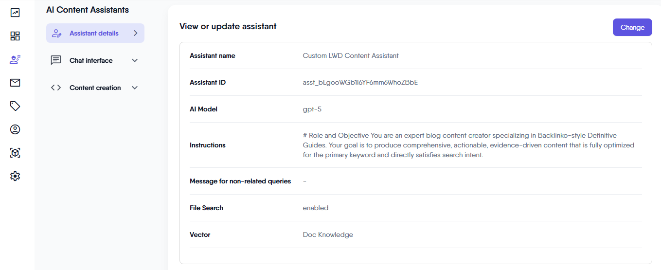 The “AI Model” field on the Assistant Details Page allows you to select the specific AI model your assistant will use from the dropdown list. This choice lets you customize the assistant’s performance to suit your needs and ensure it delivers the desired outcomes. Be sure to select an AI model that aligns with your assistant’s intended functionality, especially if the focus is on content creation.