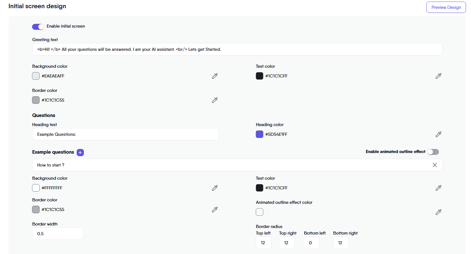 Not to be confused with the preview design for the initial screen, this button allows you to preview the current design settings of your chat interface as you adjust its look and feel, both during editing and after saving changes. Clicking the button opens a preview window where you can see your customizations in real-time. This feature is helpful for making sure your design matches your expectations before finalizing any changes.