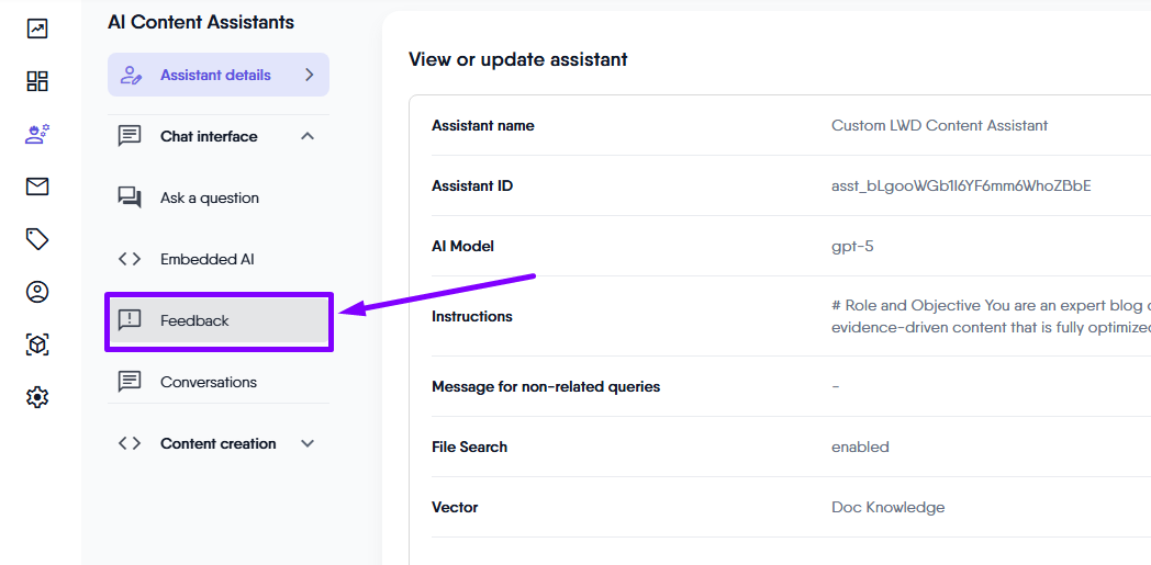 The “Feedback” page in your AI Assistant gives you insights into all feedback submitted by users during their interactions with the assistant.